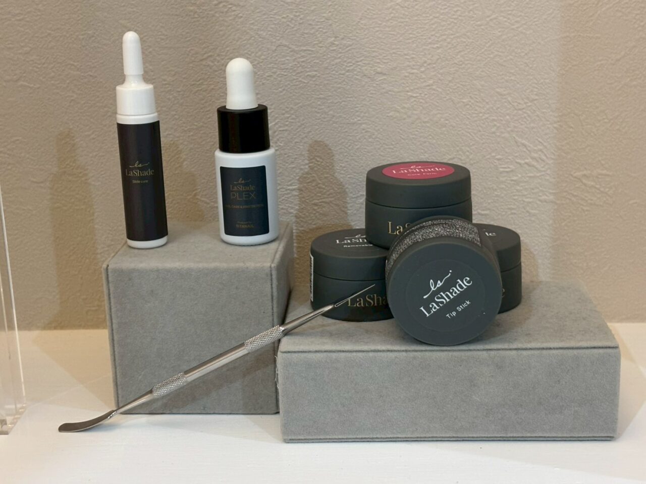 「LaShade」を使用し、美容液を使ってOFFができます。独自の粘着技術を持った“新感覚ジェル”を使い、削ることをせず健康な表面の爪の上に、下地で作っておいてジェルではがすようになります。自爪を傷めない、美容液なので自爪を綺麗にケアしながらはがせるジェルを使っていきます。