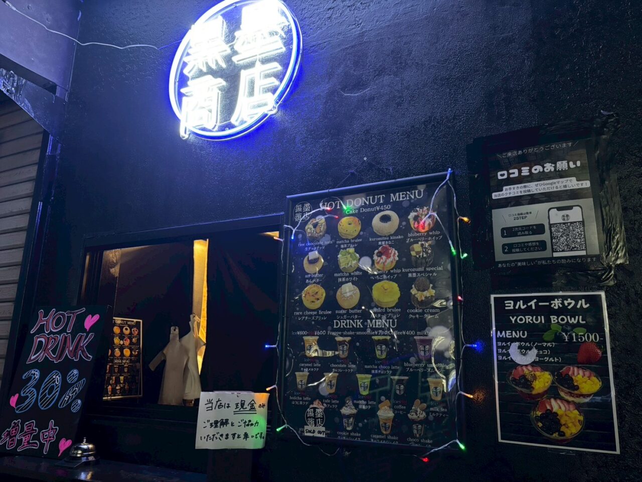 本厚木駅から車で約16分、飯山方面へ向かって進み、アツギトレリスを通り過ぎ、プレシア 本社工場がある温水交差点の中華料理 揚子江の並びに、夜ドーナツ専門店「黒墨商店 厚木店」が2025年11月にオープンしました!