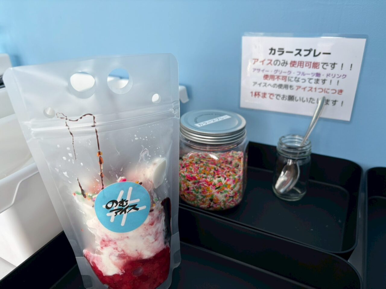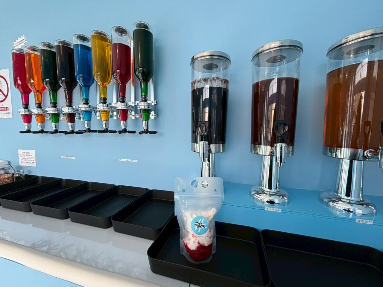 店内で出来上がりを待ちます。そのままでももちろん美味しいのですが、自分好みにカスタマイズすることができます。今回は、パウチタイプのストロベリーを注文しました。