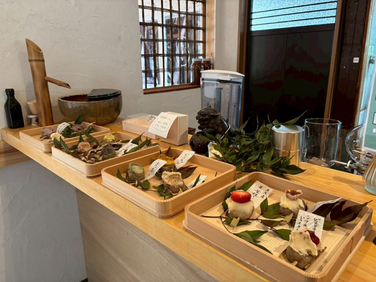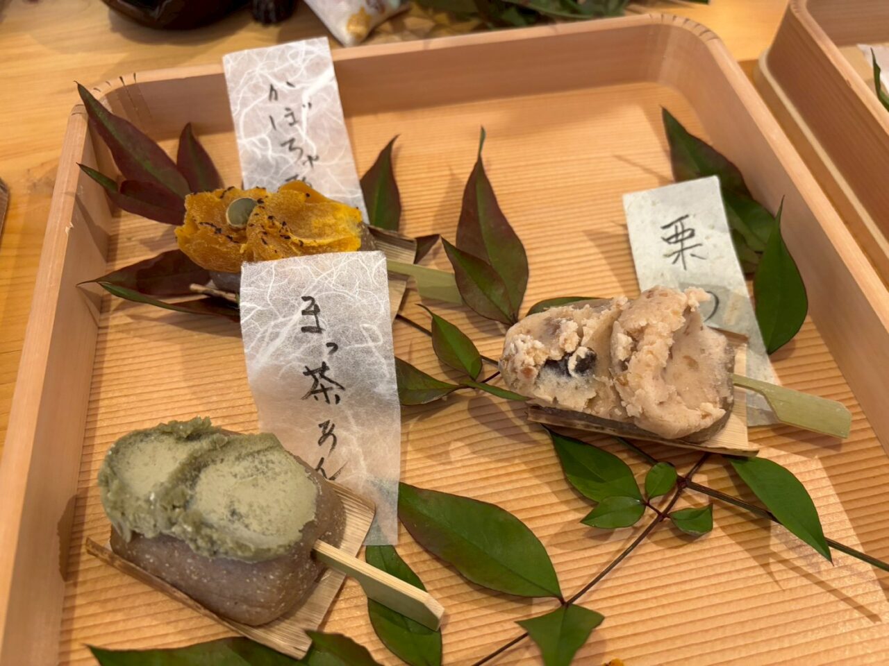 市田柿とクリームチーズあん、半原産黄金柑といちご、ピスタチオやシナモン、かぼちゃにドライクランベリーの入ったあんなど季節を感じるお団子