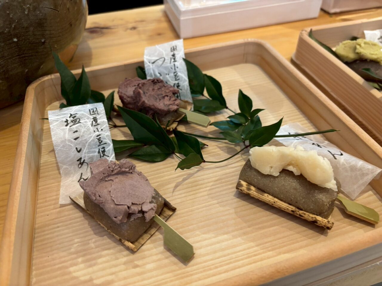 訪れた日のマゴベヱ団子のメニューは、国産小豆使用の塩こしあん、つぶあん、絹あん