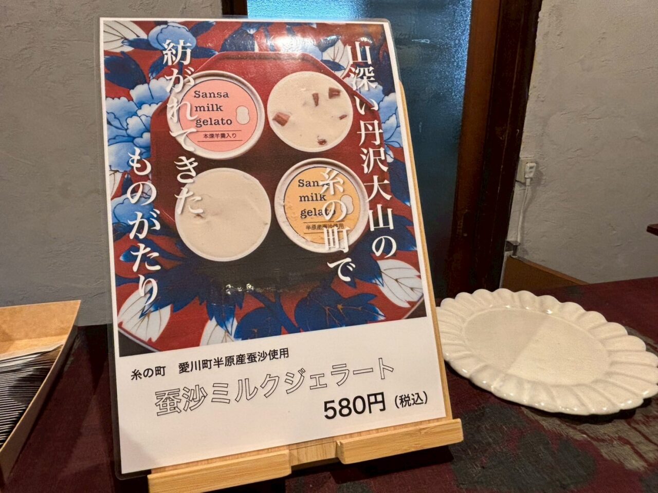 お団子を楽しんだ後、さらに気になるメニューを発見! 愛川町半原産の蚕沙を使用した「蚕沙ミルクジェラート(580円)」です。