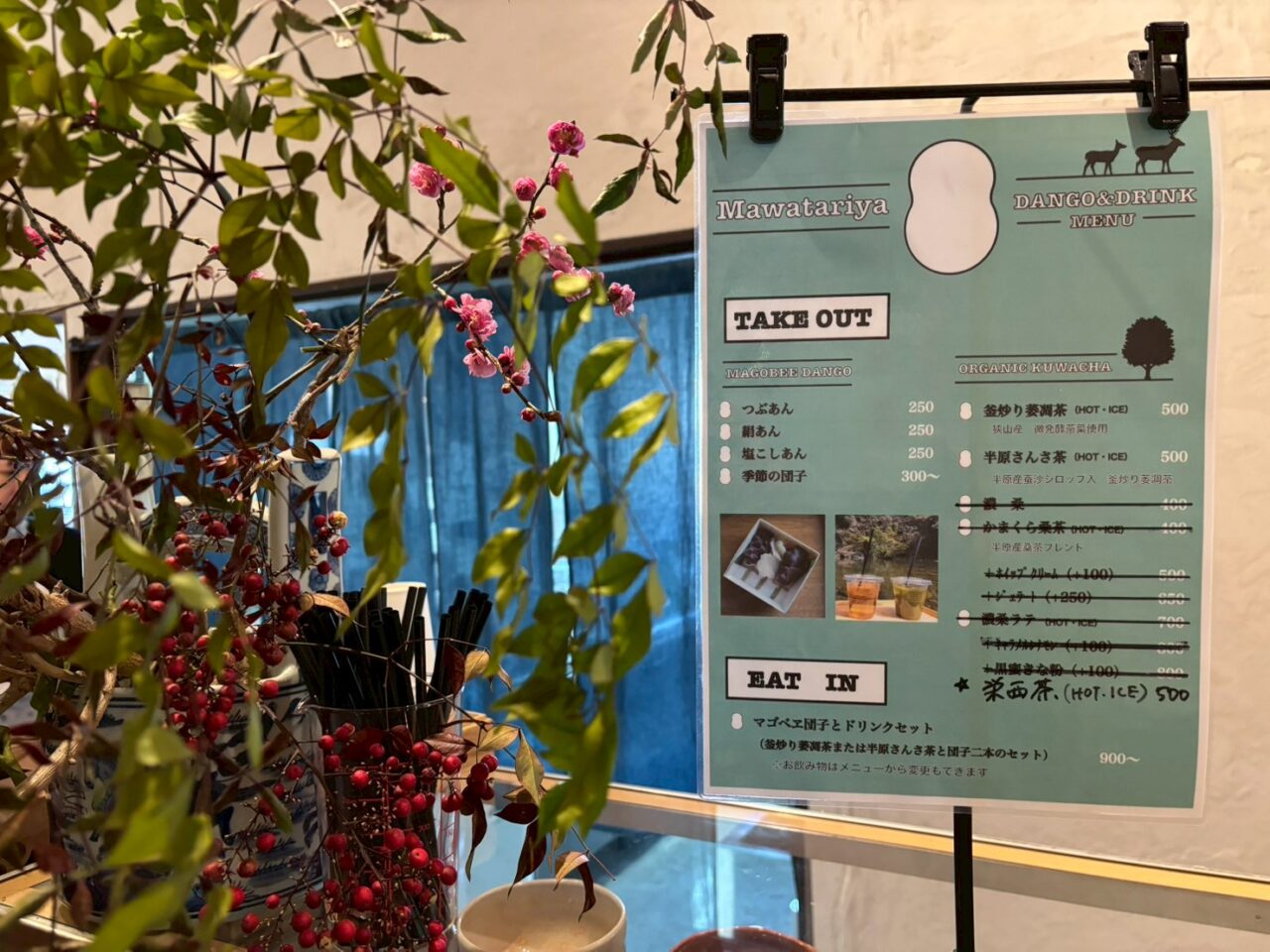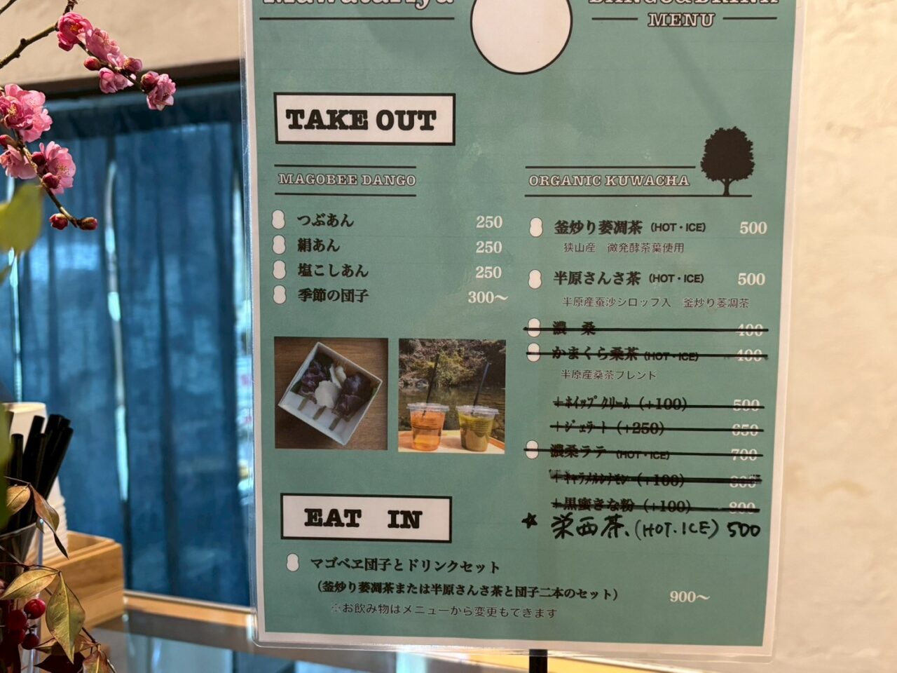 メニューは、マゴベヱ団子とオーガニックのお茶とドリンクとお団子のセットがあります。
