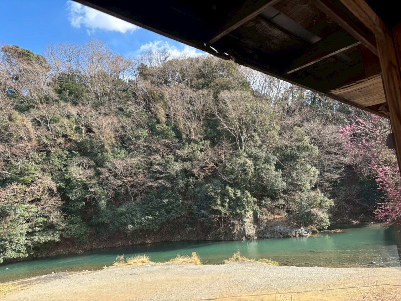 店内の大きな窓から見下ろすと、目の前には清らかな中津川がゆったりと流れています。 この日は、冷たい水面をスイスイと泳ぐ鴨(カモ)たちの姿も見ることができました。お店の方のお話ではカワセミが飛んでいる姿を見えることもあるそうです。
