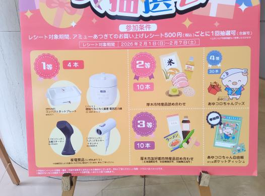 2月1日以降にアミューあつぎでお買い物や食事をされる方は、レシートを捨てずに大切に保管しておきましょう! 週末は家族みんなで、運試しとあゆコロちゃんのお祝いに出かけてみませんか?