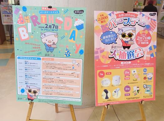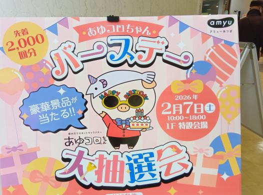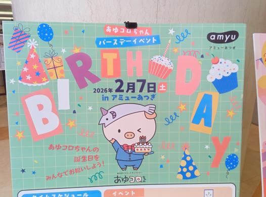 2月1日に誕生日を迎えるあゆコロちゃんをお祝いして、2026年2月7日(土)、アミューあつぎにて盛大な「あゆコロちゃんバースデーイベント」が開催されます!