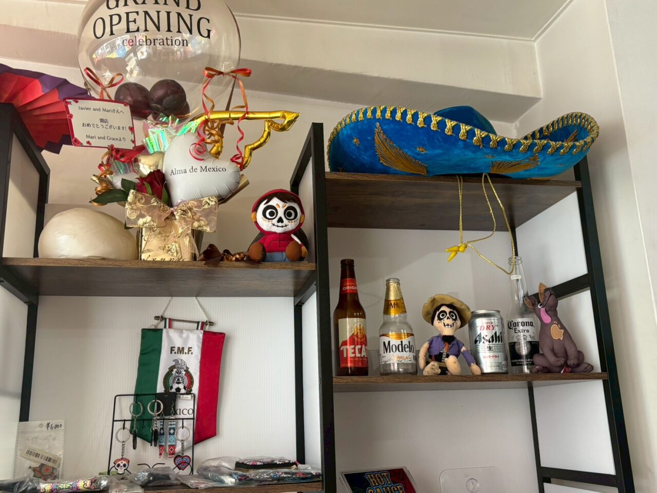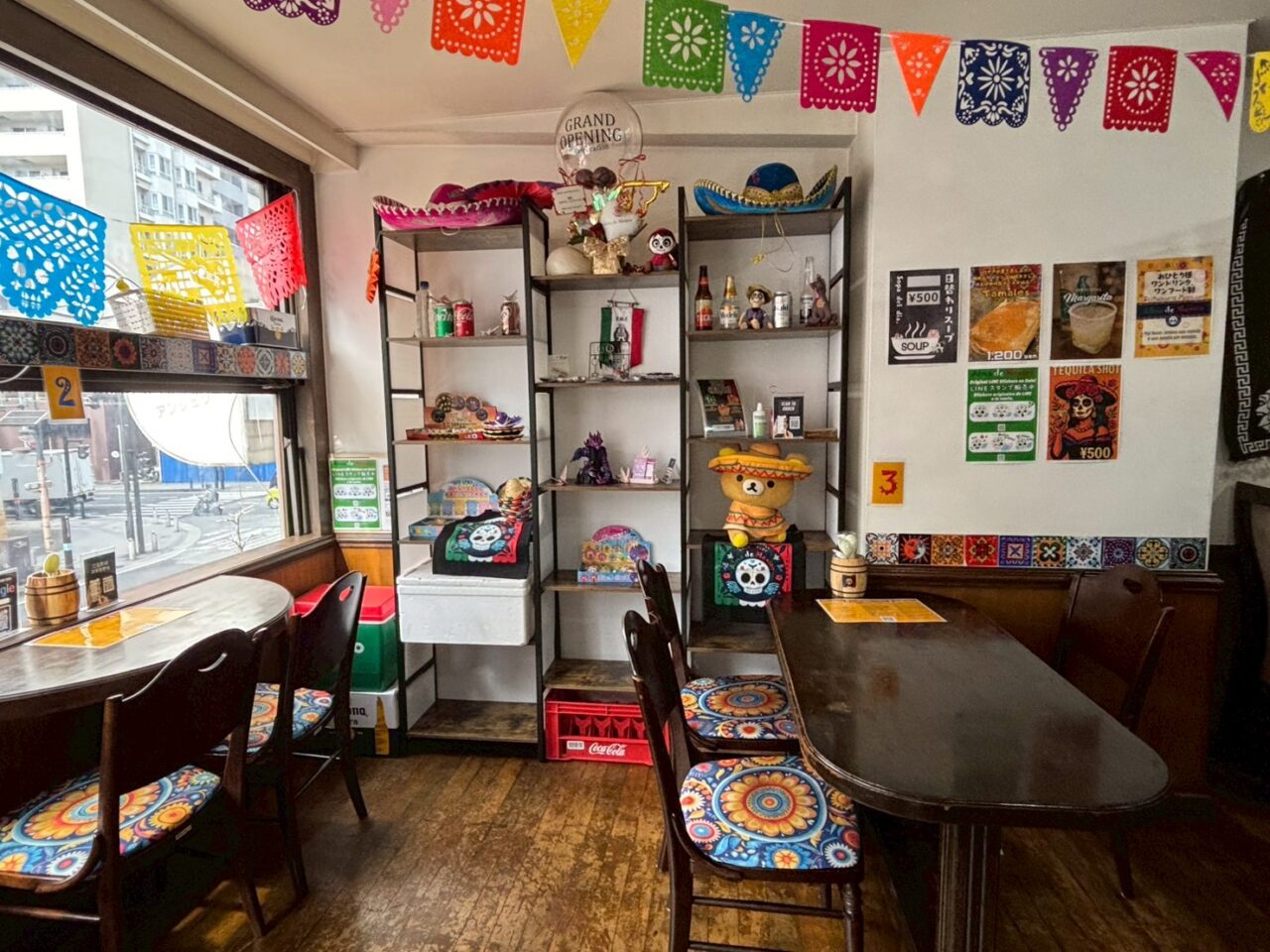 天井には、鮮やかな旗「パペルピカド」!メキシコ風のハットや可愛らしいガイコツのオブジェなど、どこを切り取ってもフォトジェニックな空間が広がっています。
