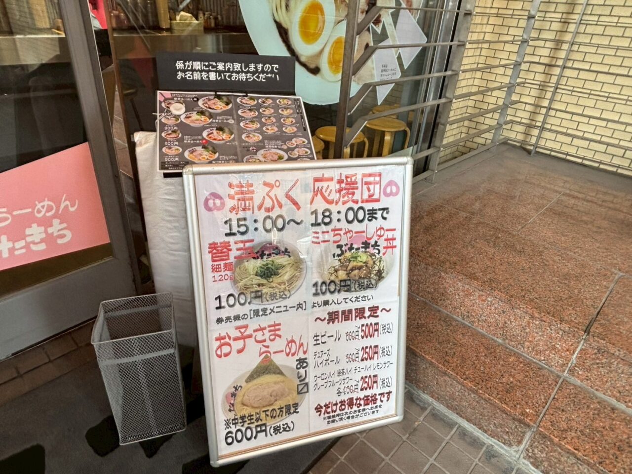 お得な時間帯:15:00~18:00まで満ぷく応援団として替玉が120円のところ100円で、ミニちゃーしゅー丼が100円で購入できます。
