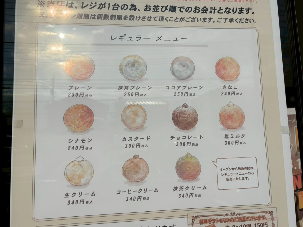 オープン時から用意されるメニューは、なんと11種類!シンプルに生地を味わう「プレーン」から、贅沢な「抹茶クリーム」や「塩ミルク」まで、どれにしようか迷ってしまいそうな顔ぶれです。