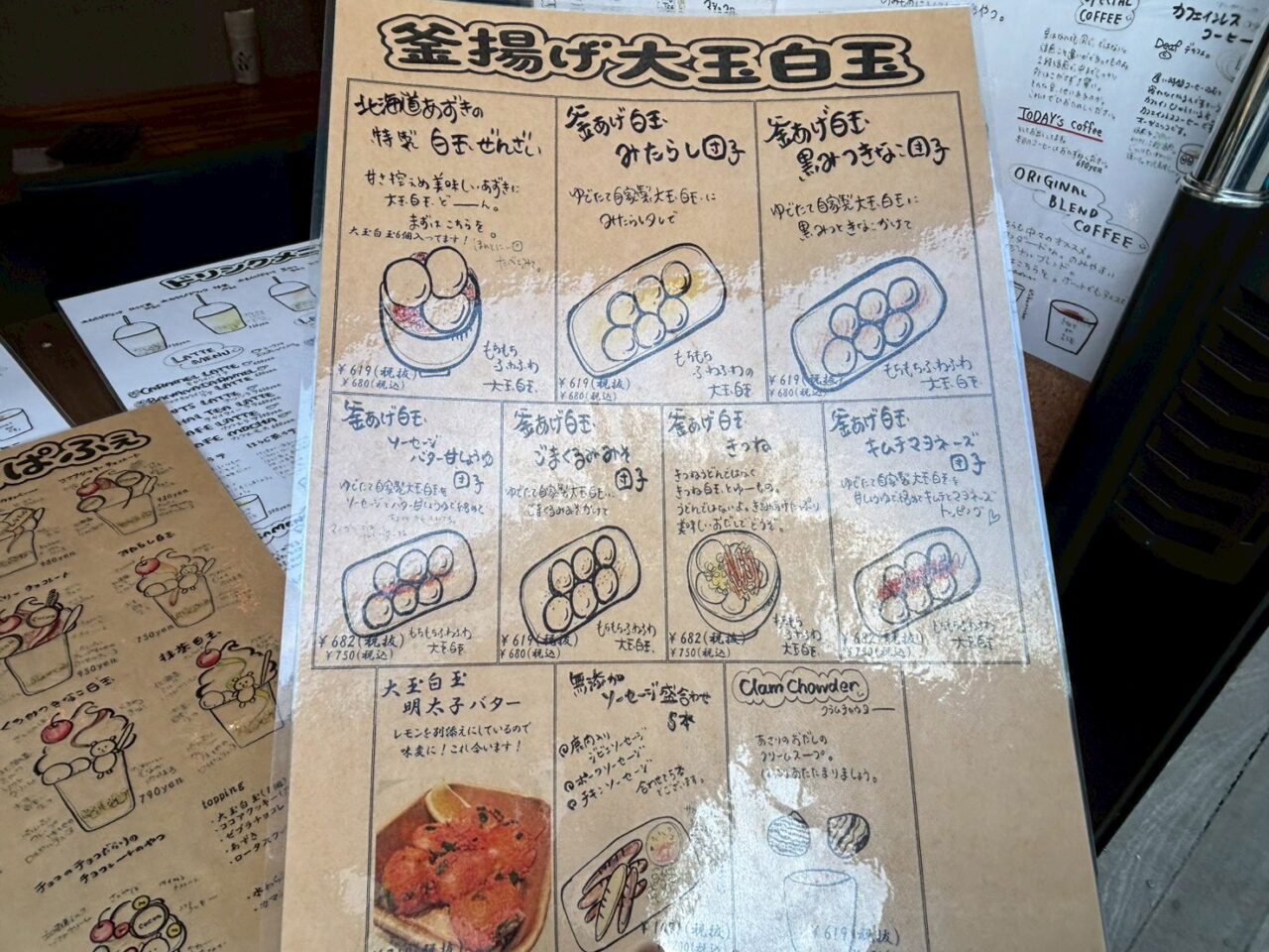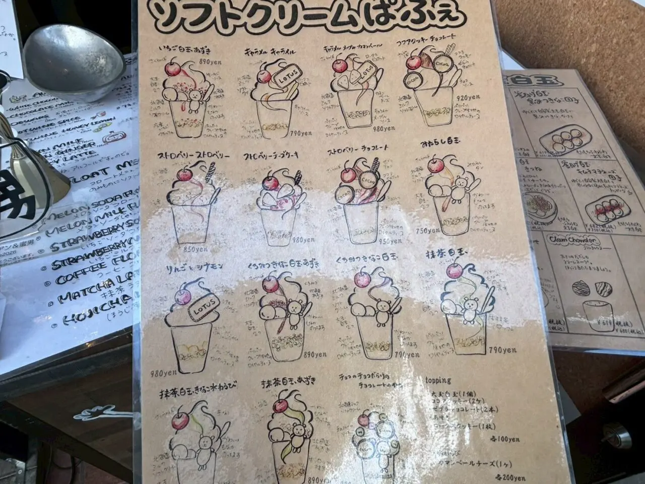 店頭に掲げられたメニューを見て驚くのが、そのバリエーションの多さ! ソフトクリームパフェから、温かい釜あげ白玉、さらにはおつまみ系のグルメまで揃っています。